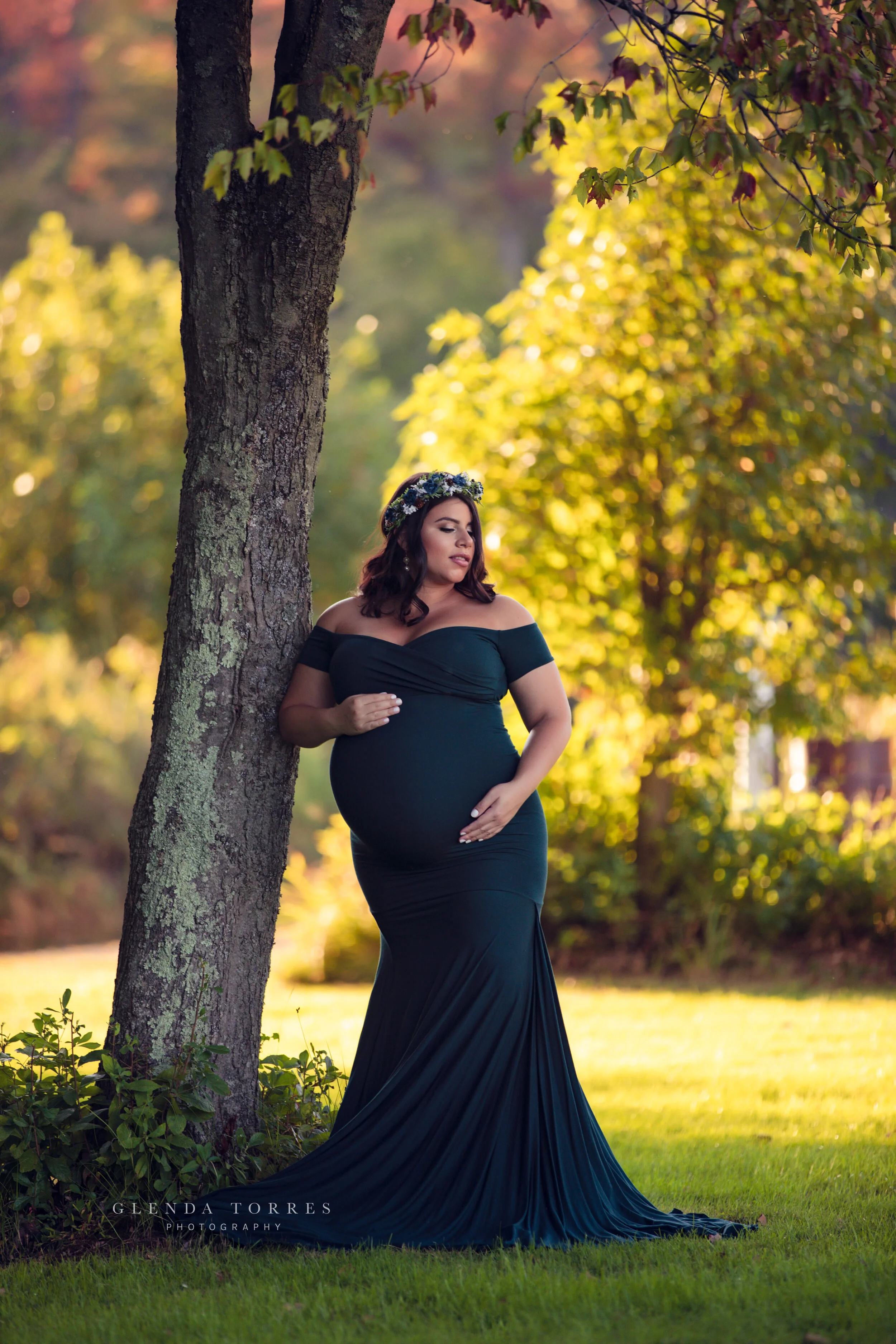 Pregnant woman in a dark green dress and floral crown leaning against a tree in a sunlit park.